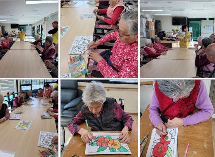 동백꽃 색칠하기(치매전담실 - 느영나영) (사)느영나영복지공동체 시니어 봉사자분들께서 오늘 준비하고 오신 프로그램은 '동백꽃 색칠하기'입니다.